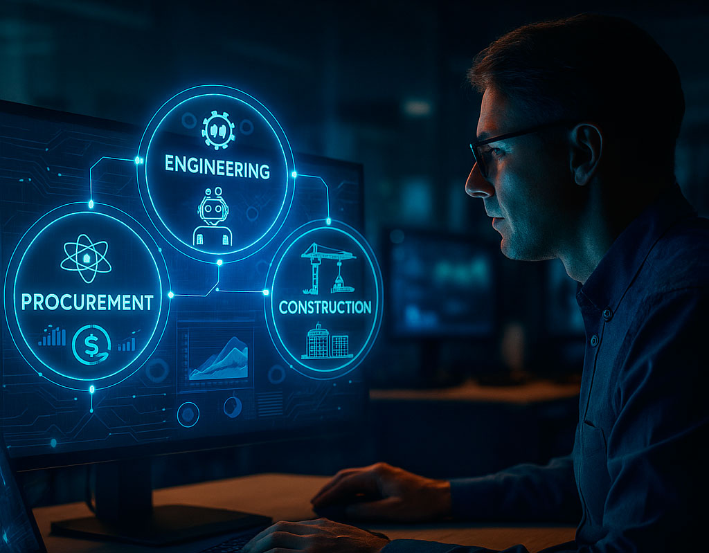 Unified EPC platform: 100% cloud-based interoperability connecting design, supply, and construction data streams. Continuous feedback loops enhance learning and predictive accuracy across future projects. AI algorithms transform project data into actionable insights for ongoing performance optimization.